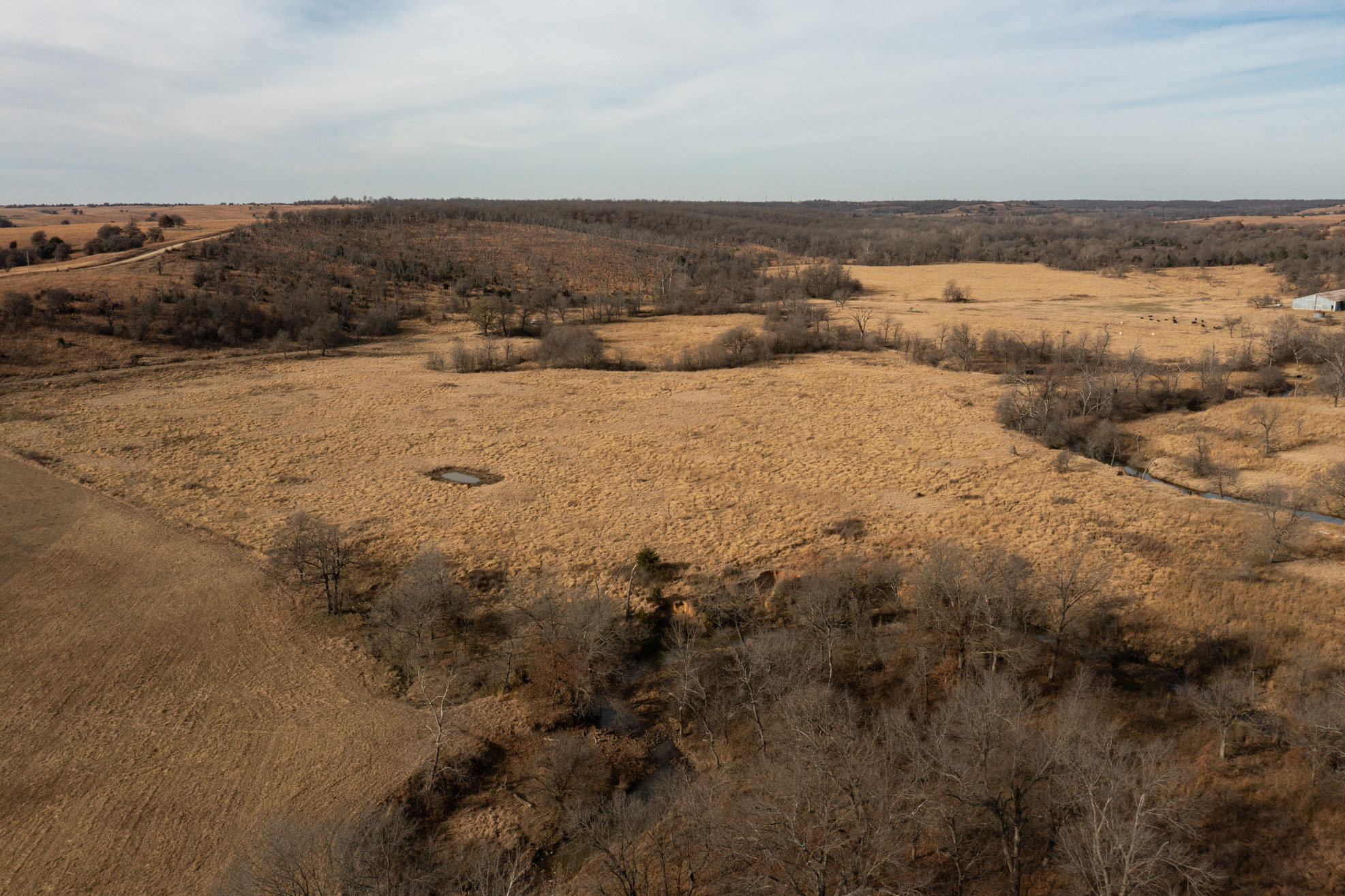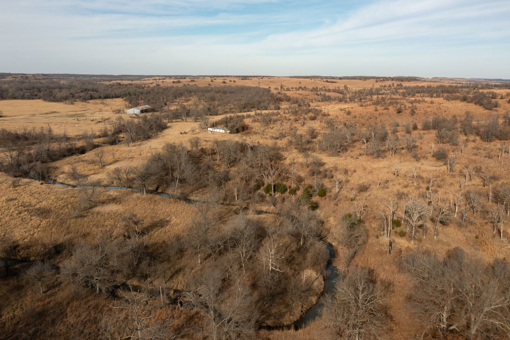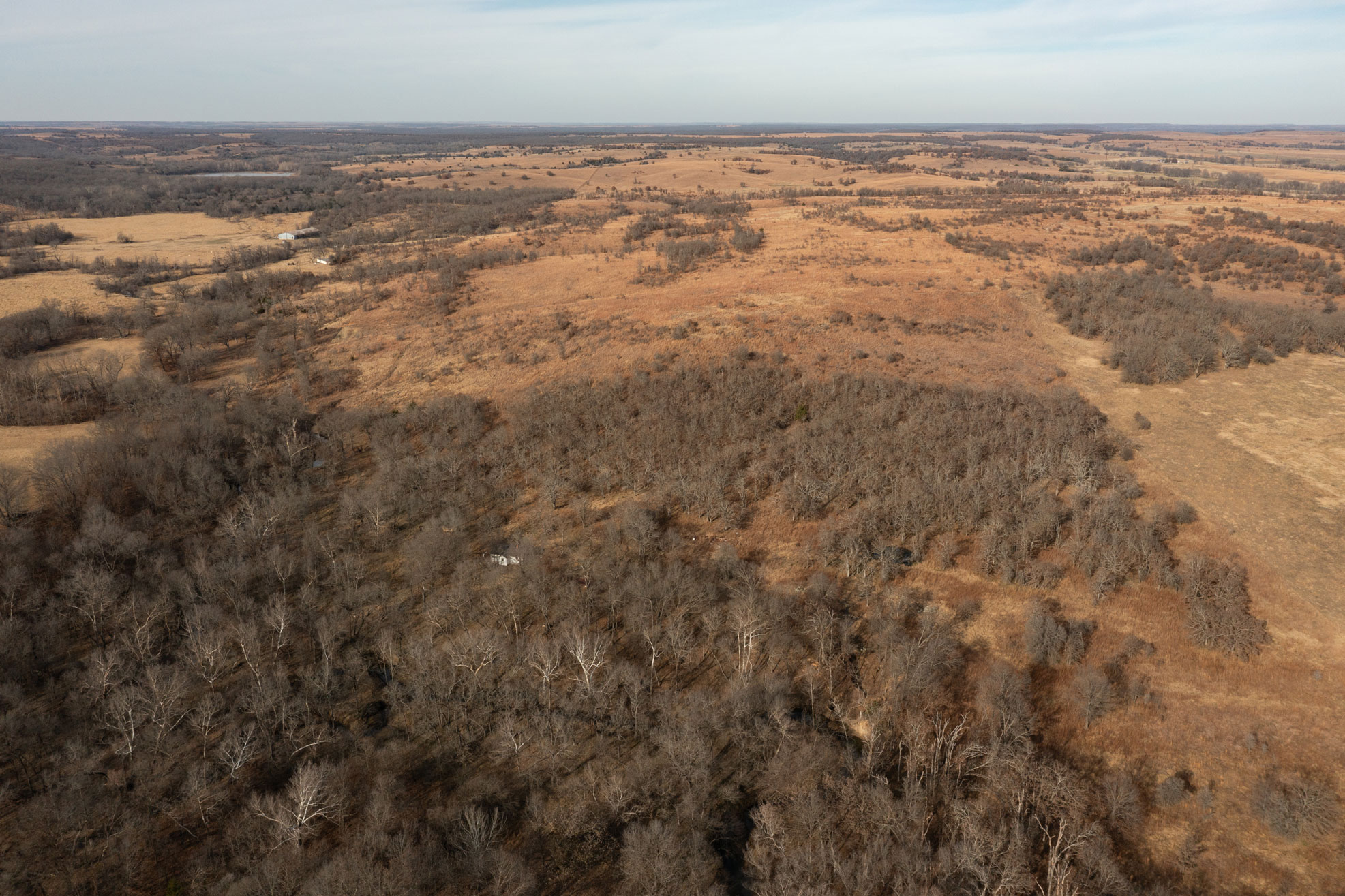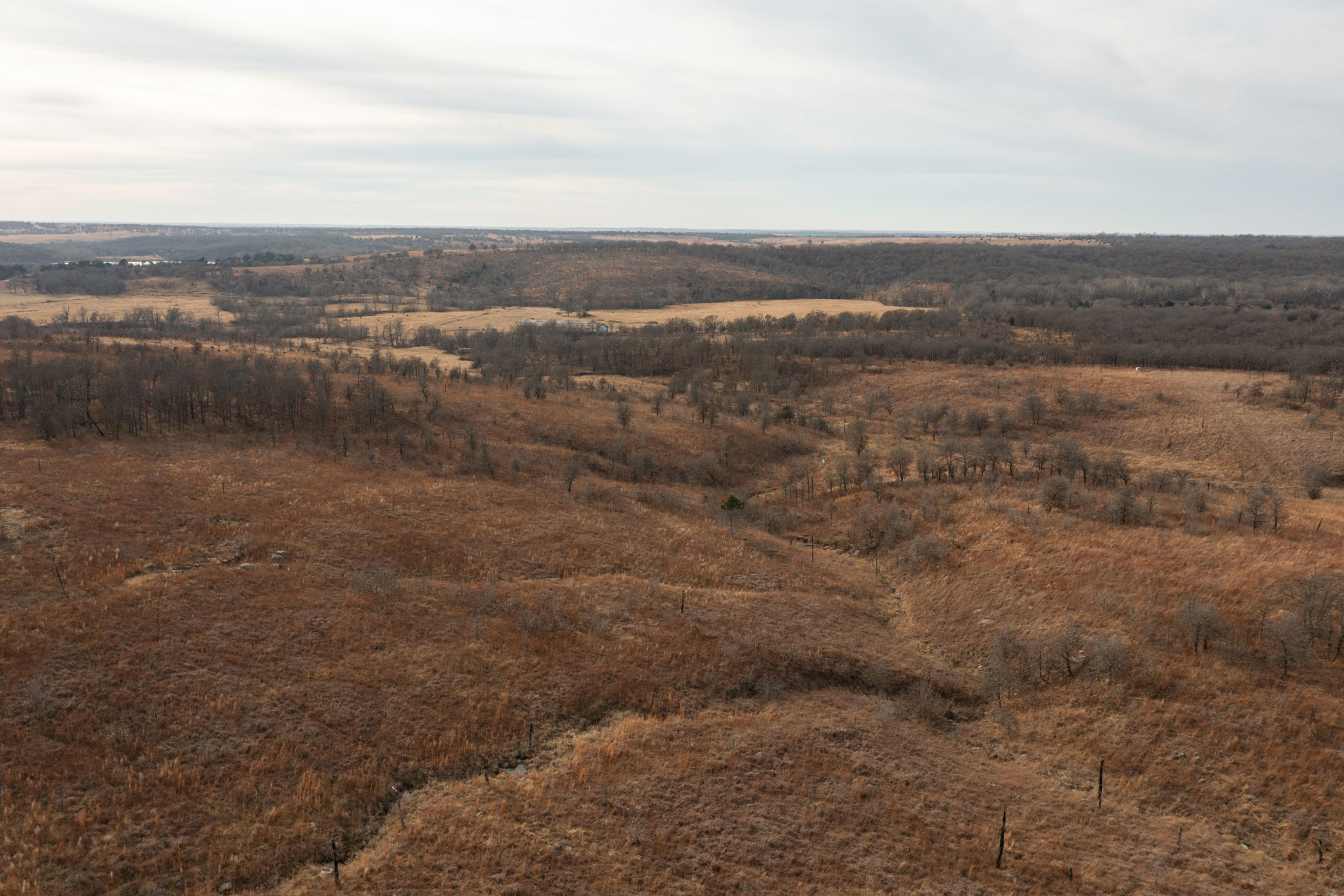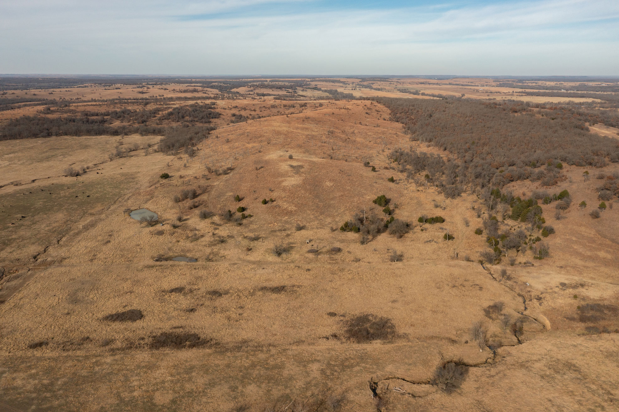 The ranch contains a mosaic of tallgrass prairie, cross timbers vegetation and riparian bottom land. From the peaks of the Chautauqua hills to the winding creek bottom, the topography on the property includes approximately 250ft of rugged elevation changes. Sandstone soils support native grasses, forbs, and legumes with a variety of upland woody species and hard mast producing bottomland timber. The mile of California Creek truly enhances the unique qualities of the ranch.