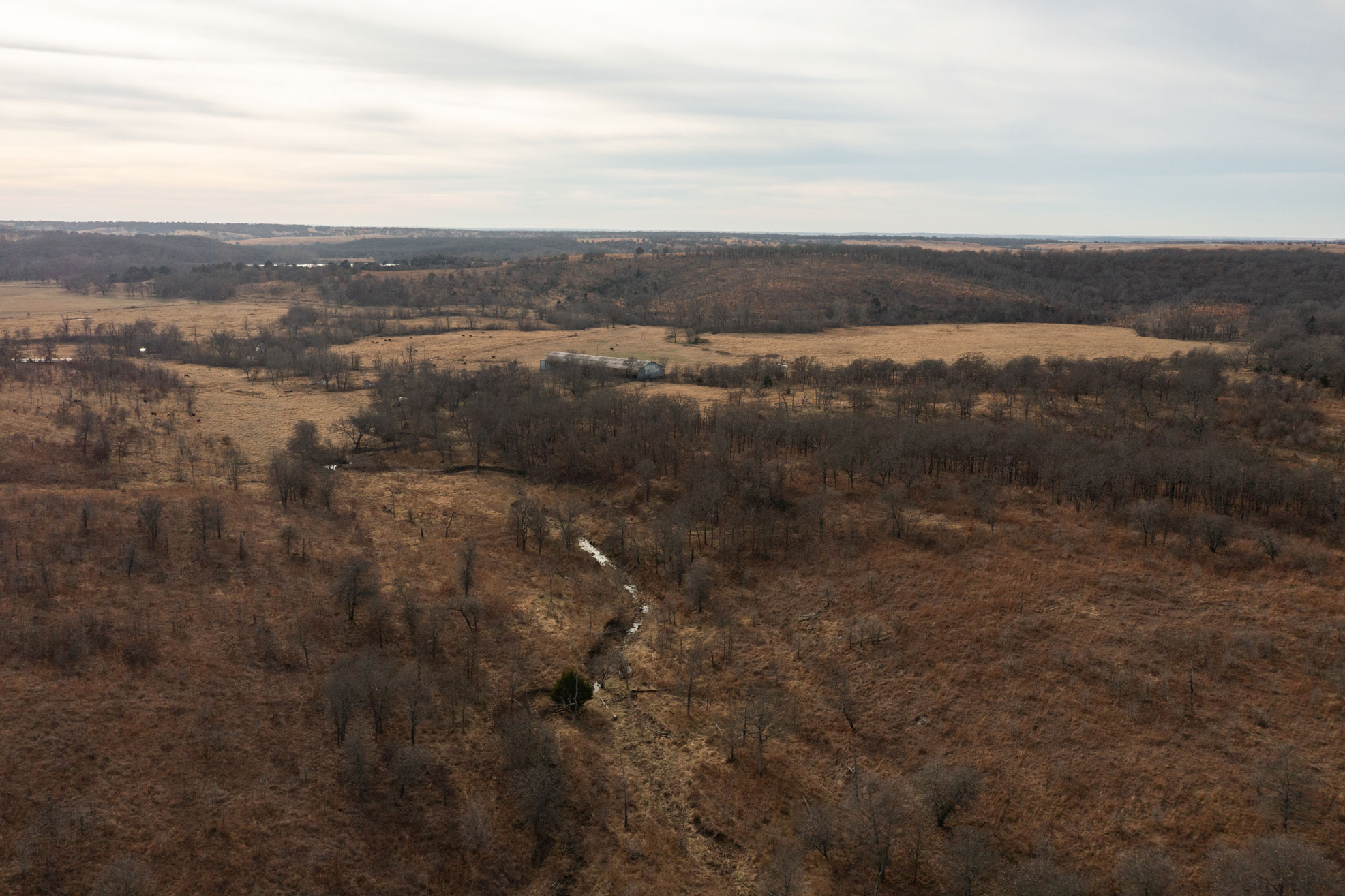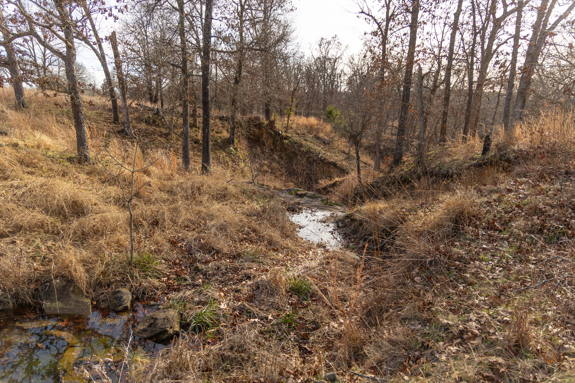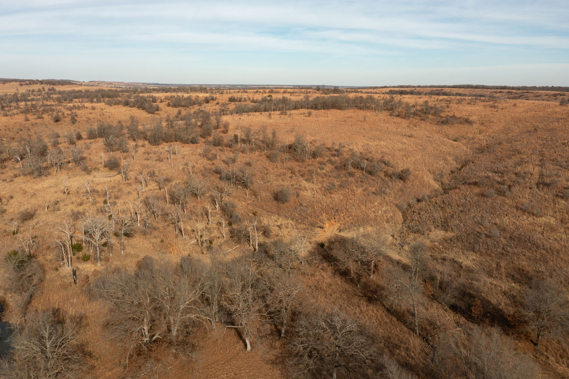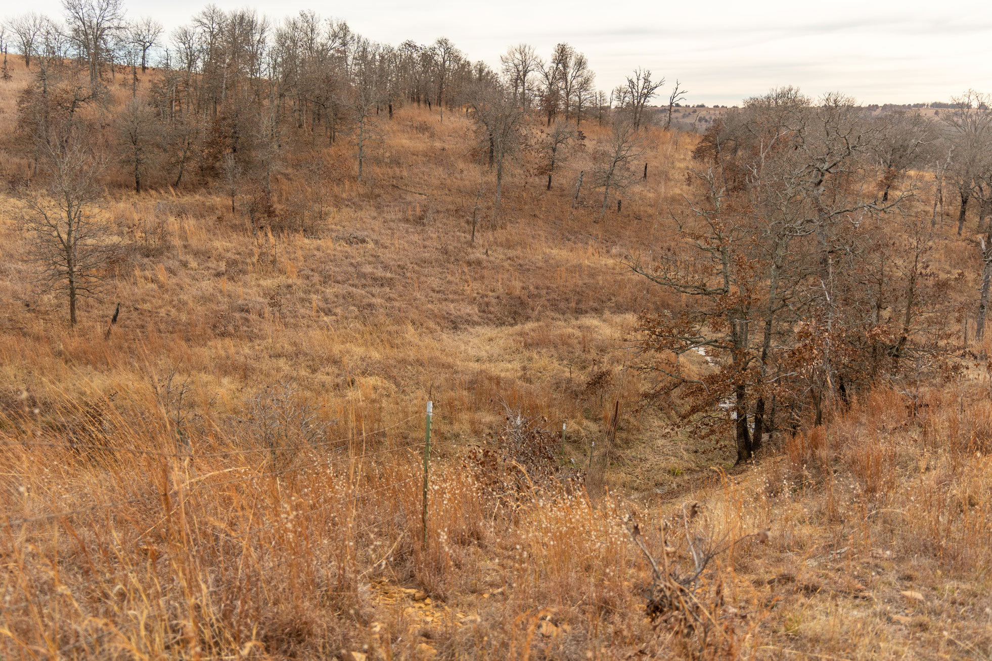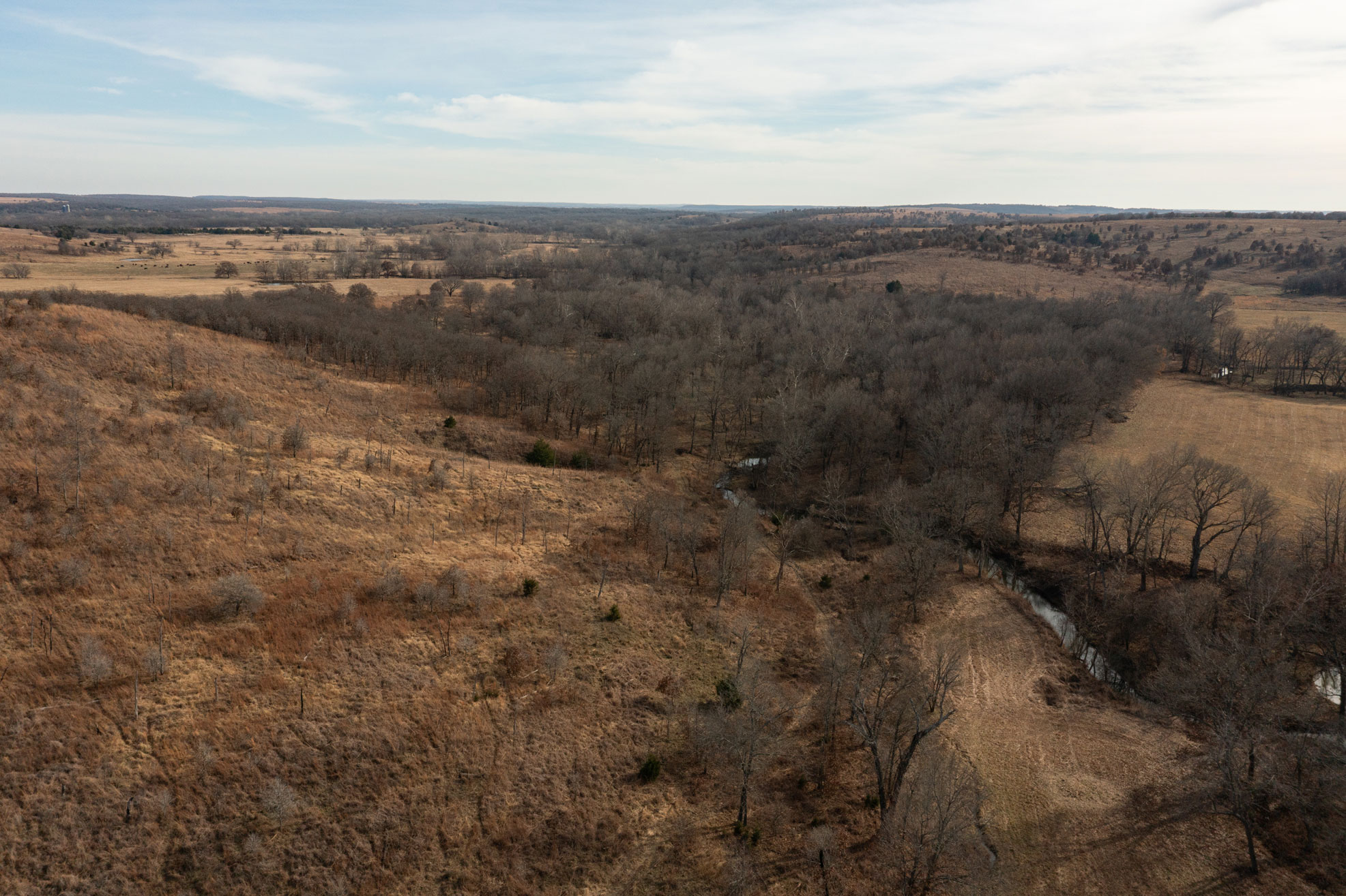 The ranch contains a mosaic of tallgrass prairie, cross timbers vegetation and riparian bottom land. From the peaks of the Chautauqua hills to the winding creek bottom, the topography on the property includes approximately 250ft of rugged elevation changes. Sandstone soils support native grasses, forbs, and legumes with a variety of upland woody species and hard mast producing bottomland timber. The mile of California Creek truly enhances the unique qualities of the ranch.