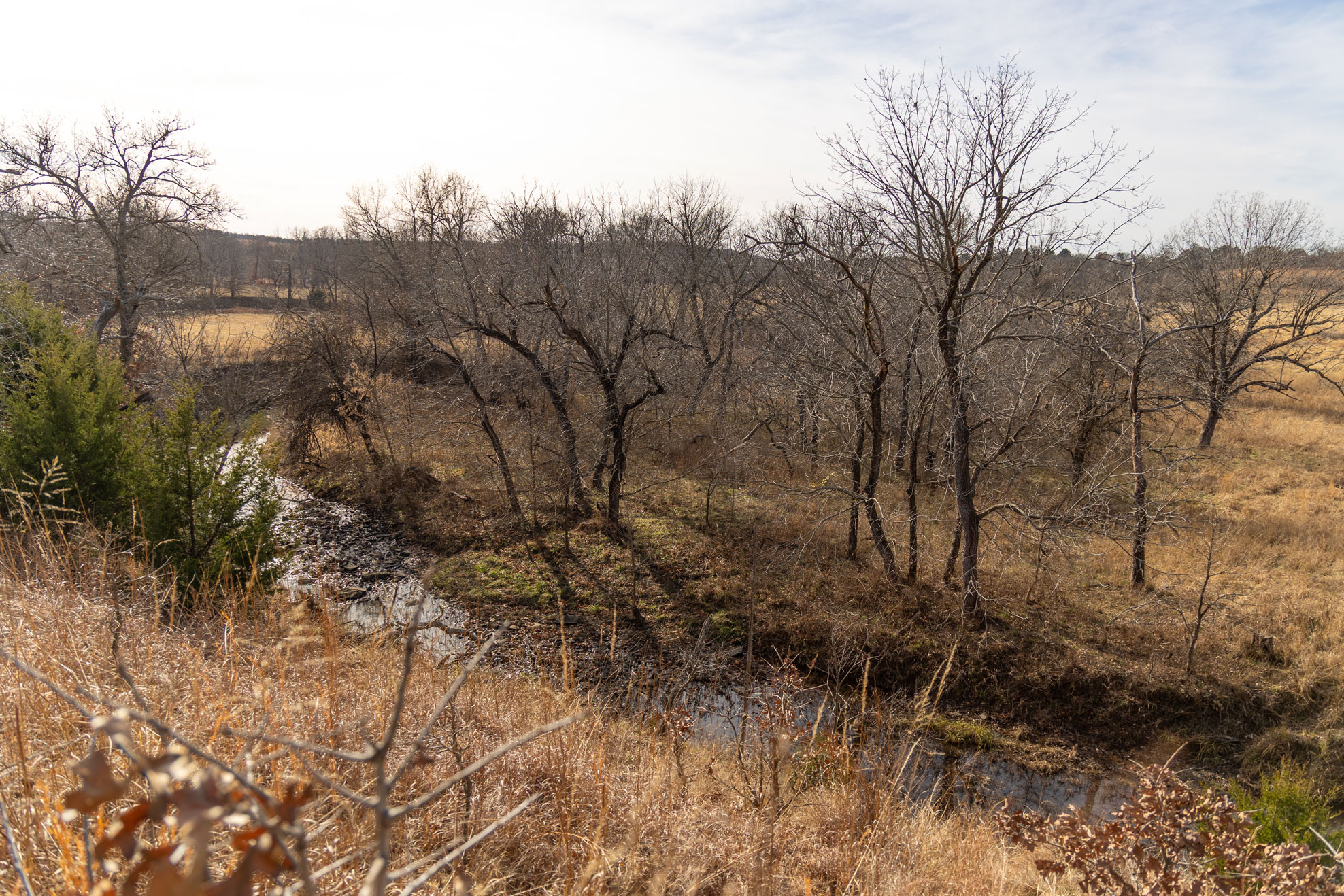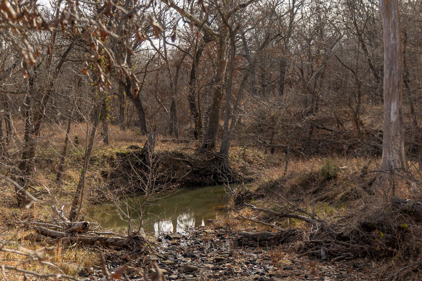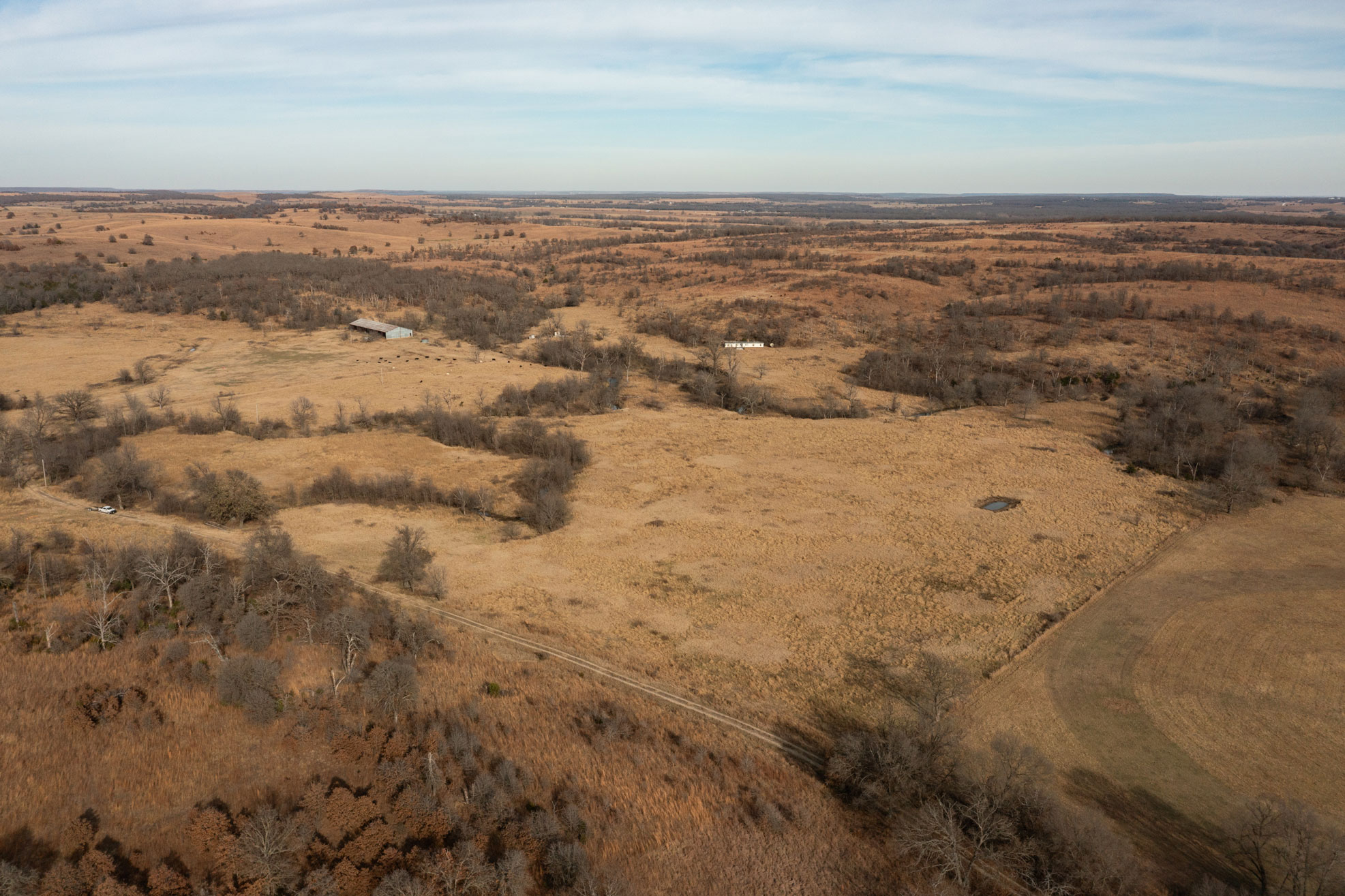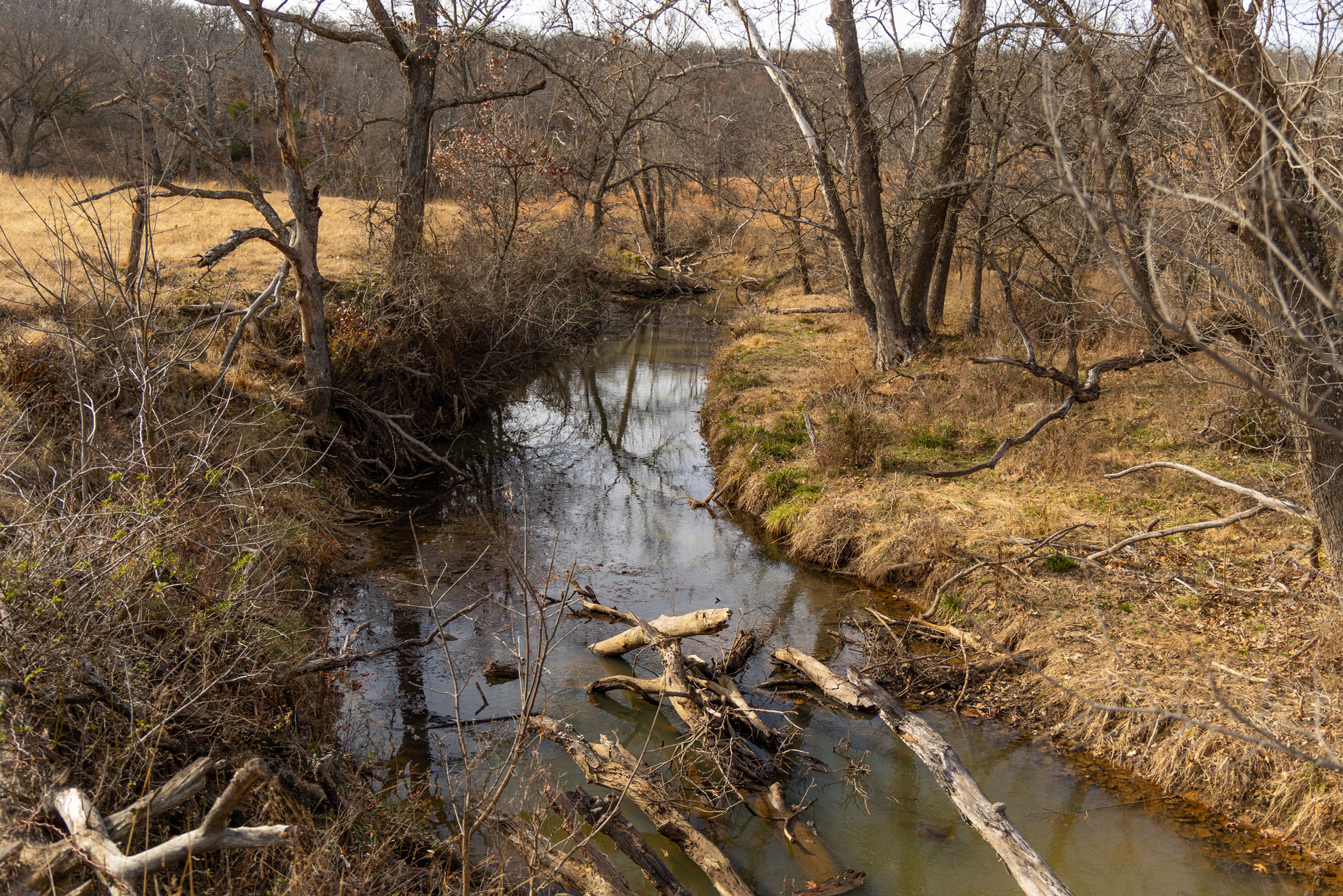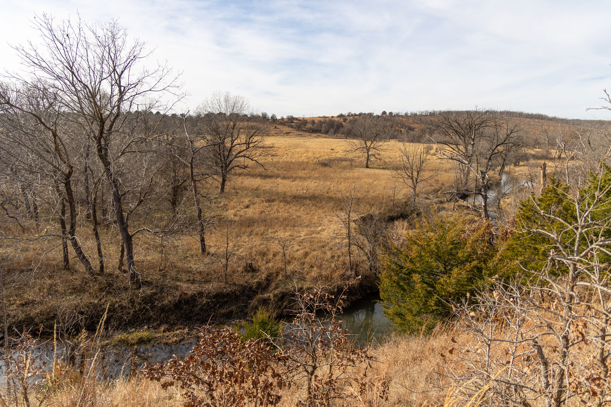 The ranch contains a mosaic of tallgrass prairie, cross timbers vegetation and riparian bottom land. From the peaks of the Chautauqua hills to the winding creek bottom, the topography on the property includes approximately 250ft of rugged elevation changes. Sandstone soils support native grasses, forbs, and legumes with a variety of upland woody species and hard mast producing bottomland timber. The mile of California Creek truly enhances the unique qualities of the ranch.